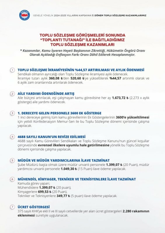 Memur-Sen, kamu görevlilerinin ve memur emeklilerinin 2024-2025 yıllarındaki mali, sosyal, özlük ve demokratik haklarını kapsayan 7. Dönem Toplu Sözleşmede, genele yönelik 59 maddeden oluşan toplu sözleşme kazanımlarını rakam vererek paylaştı.