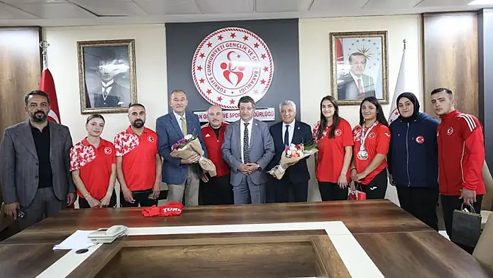 Dünya ikincisi, üçüncüsü ve beşincisi ile Avrupa ikincisi milli sporcu ve antrenörlere çeşitli hediyeler takdim eden AK Parti Milletvekili Kayhan Türkmenoğlu, 'Elde ettiğiniz başarılar, hem kendi azminizin hem de ülkemizin uluslararası alandaki potansiyelinin birer göstergesidir. İlimiz ve ülkemiz adına göğsümüzü kabartarak kazanmış olduğunuz bu gurur verici başarınızdan dolayı sizleri ve sizleri destekleyen antrenör ve ailelerinizi kutluyorum' dedi.