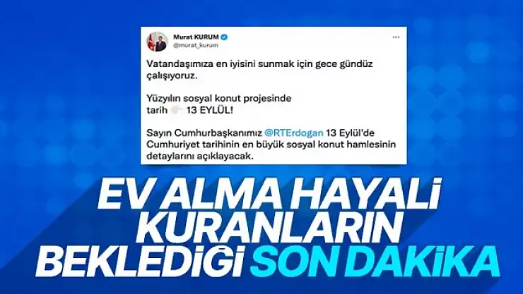 "Vatandaşımıza en iyisini sunmak için gece gündüz çalışıyoruz. Yüzyılın sosyal konut projesinde tarih 13 Eylül! Sayın Cumhurbaşkanımız 13 Eylül'de Cumhuriyet tarihinin en büyük sosyal konut hamlesinin detaylarını açıklayacak."