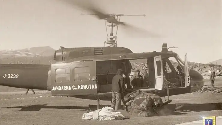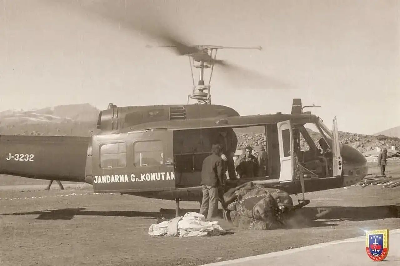 Jandarma Genel Komutanlığı, Van'ın Çaldıran ve Muradiye ilçelerini etkileyen 1976 depreminde kurtarma ve tahliye çalışmalarında görev yapan jandarma helikopterine ait tarihi görüntüleri, depremin 50'nci yılında kamuoyuyla paylaştı.