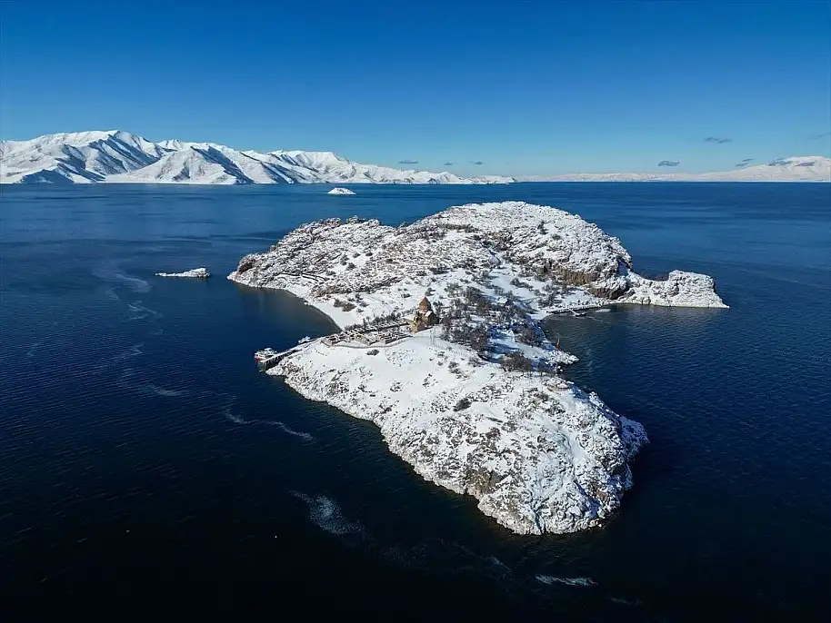 Van Gölü'nün ortasında yer alan tarihi Akdamar Adası, son günlerde etkili olan kar yağışının ardından bembeyaz bir gelinliğe büründü. Havanın sıfırın altında seyretmesine aldırış etmeyen yerli ve yabancı ziyaretçiler, adanın eşsiz kış manzarasını ve tarihi Akdamar Kilisesi'ni görmek için adeta akın etti.