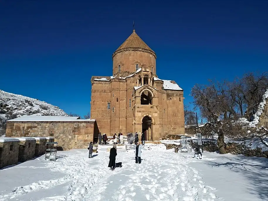 Van Gölü'nün ortasındaki tarihi Akdamar Adası, kar yağışının ardından bembeyaz bir örtüye büründü. Soğuk havaya aldırış etmeyen yerli ve yabancı ziyaretçiler, adanın eşsiz kış manzarasını görmek için adeta akın etti.
